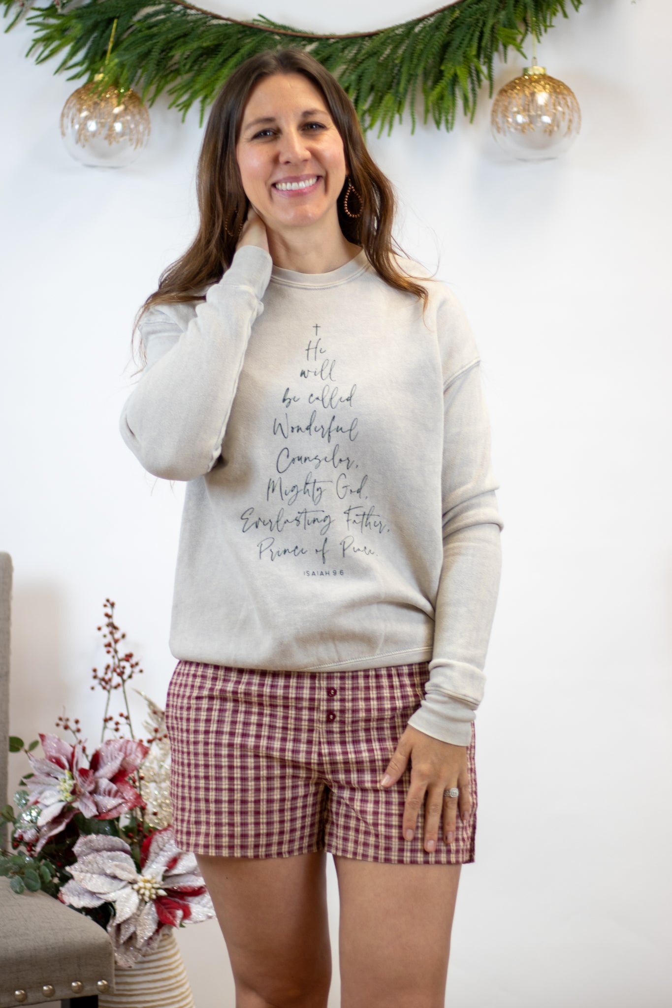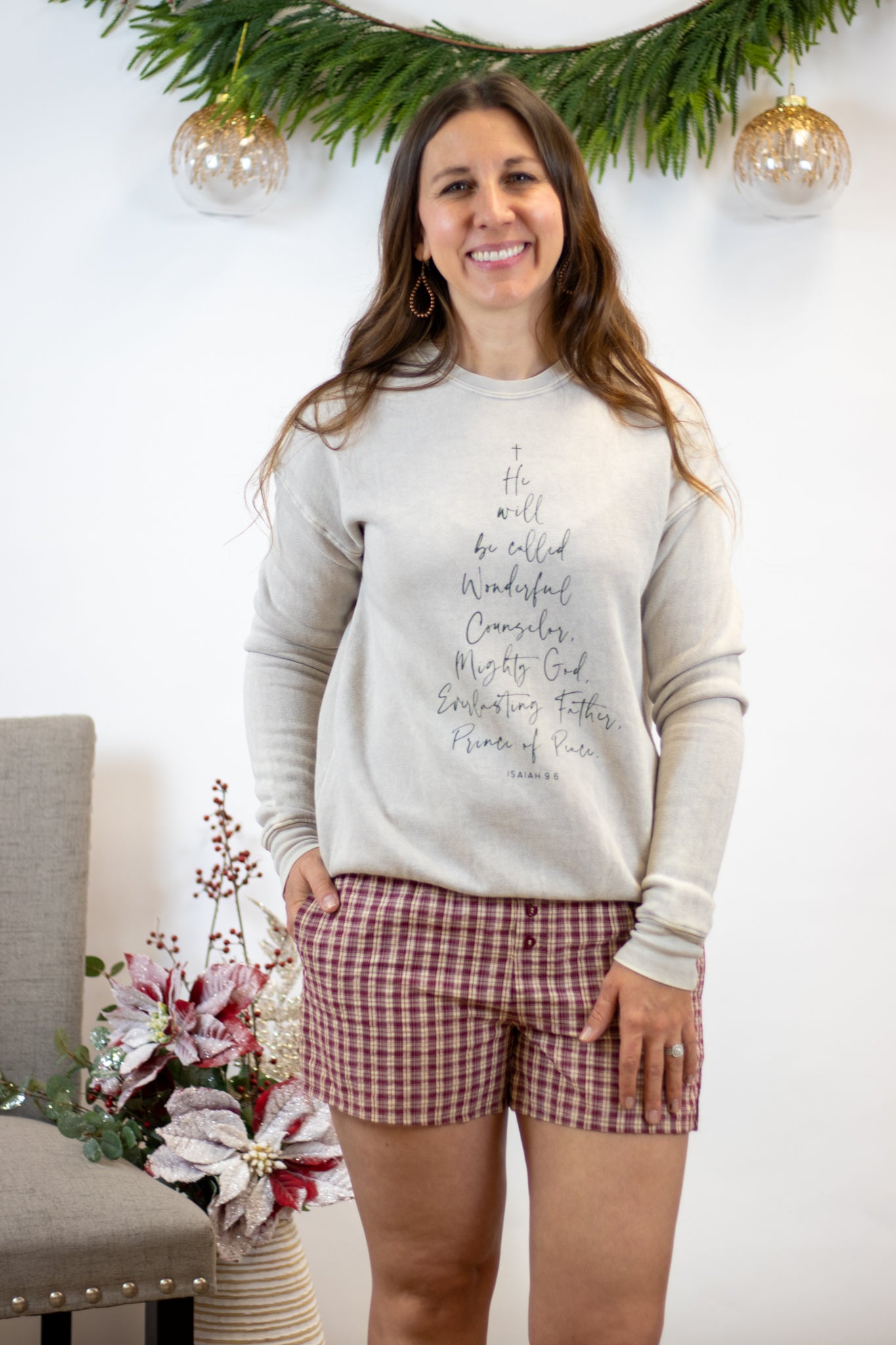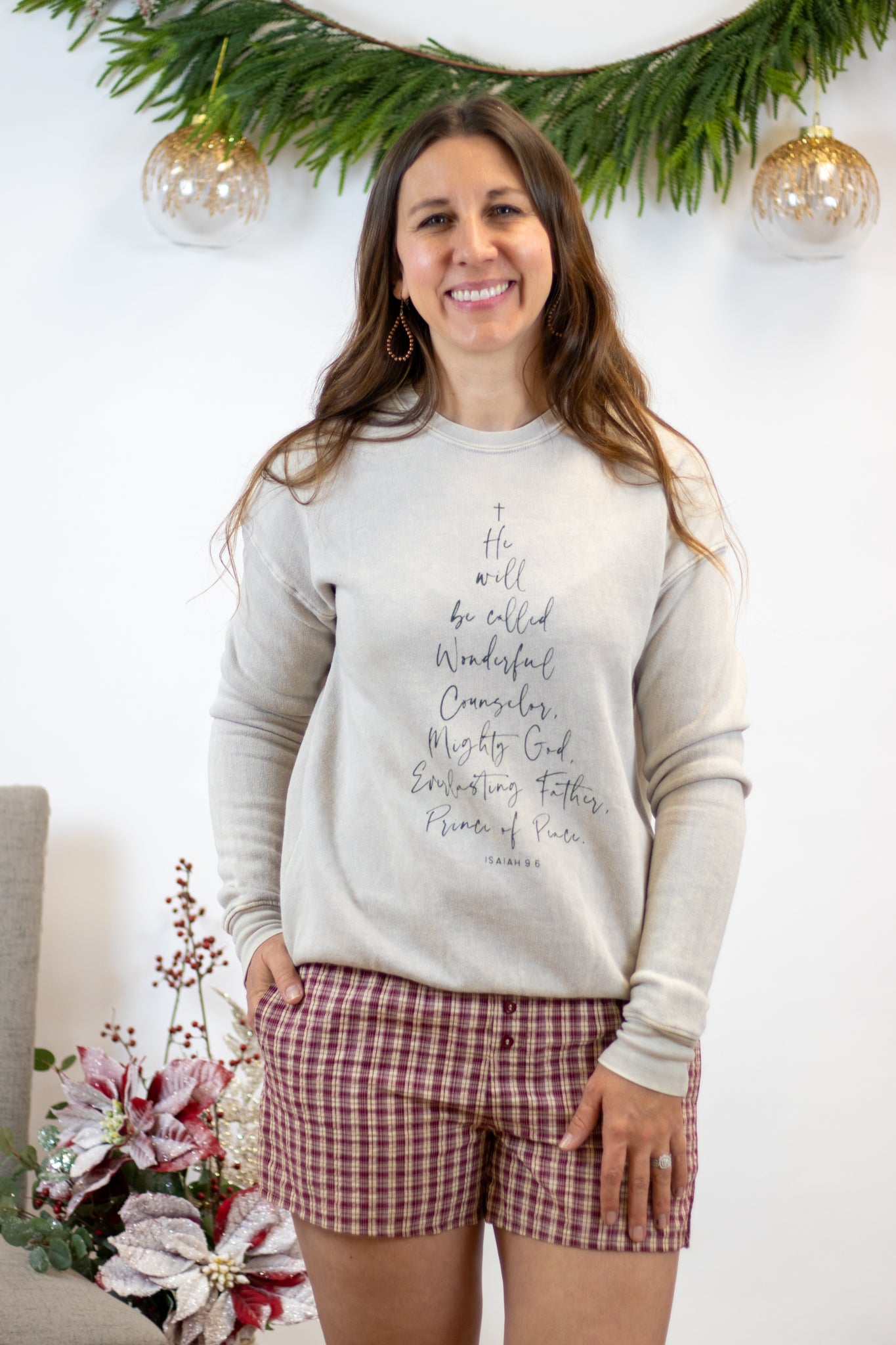 Our He Will Be Called Pullover is a beautiful reminder of the reason for the season. Featuring the words from Isaiah 9:6 arranged in the shape of a Christmas tree, this pullover is soft, meaningful, and perfect for cozy holiday moments. The neutral sand tone pairs effortlessly with anything in your closet — we especially love it styled with our Jolly Plaid Boxer Shorts for a festive look. The fit is true to size with a comfortable, relaxed feel you’ll want to live in all season long.