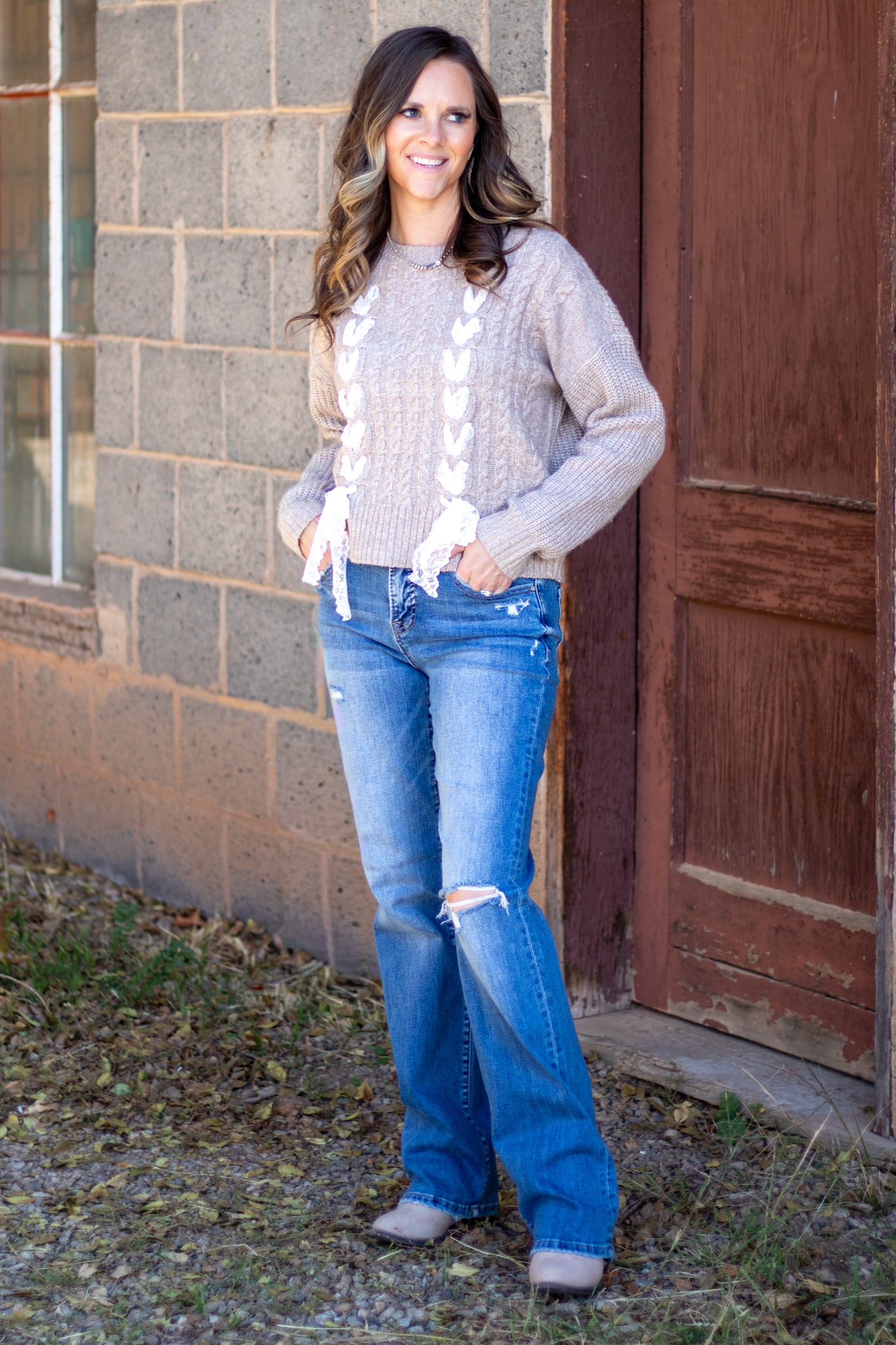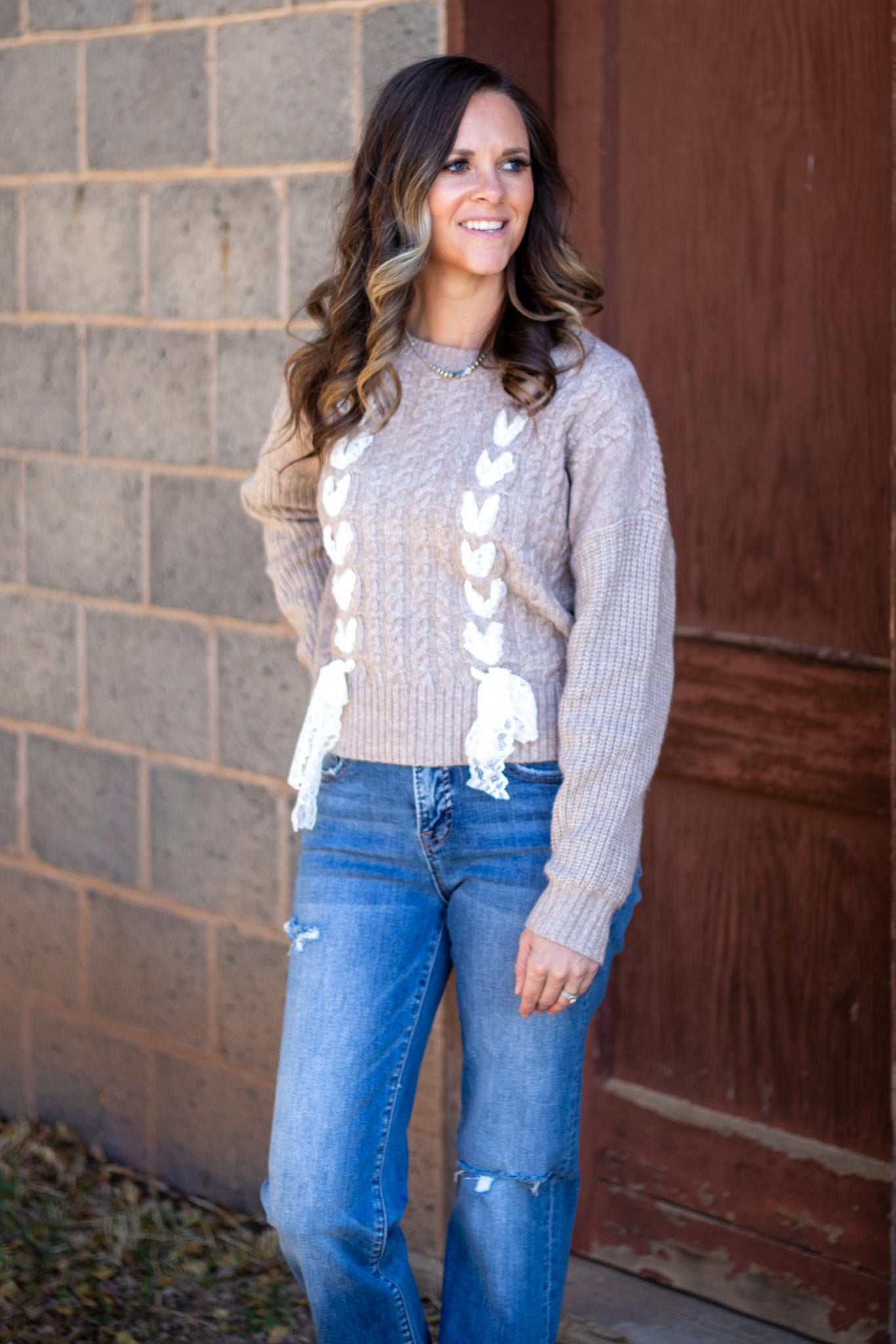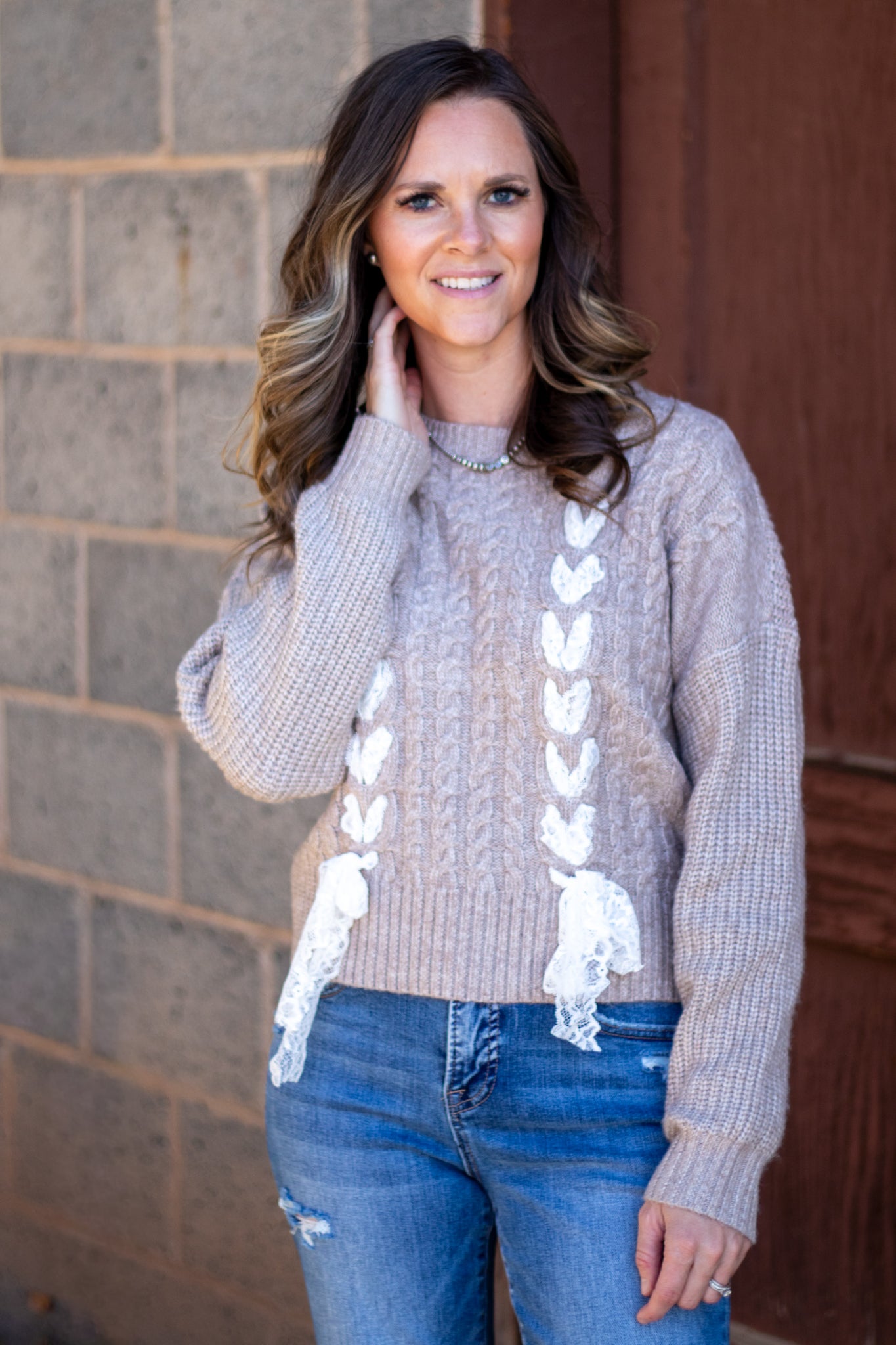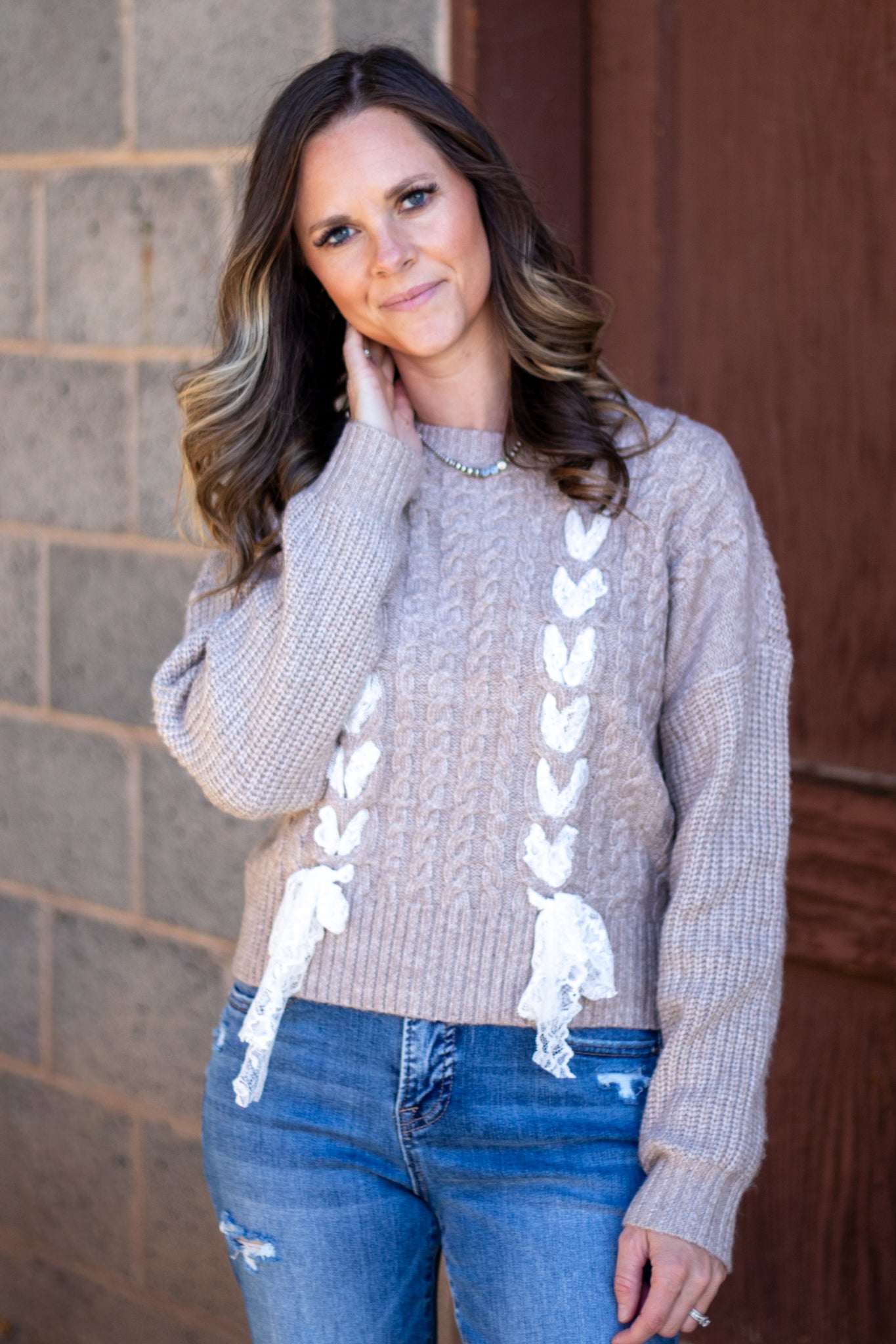 Meet the sweetest statement sweater of the season! This taupe cable-knit beauty features darling white lace bow detailing down the front—adding the perfect touch of charm and femininity. The cozy knit feels amazing on, and the flattering silhouette makes this an easy, adorable option for all body shapes. Whether you're dressing it up or keeping it casual, this unique sweater brings effortless style to any look. Fits true to size.