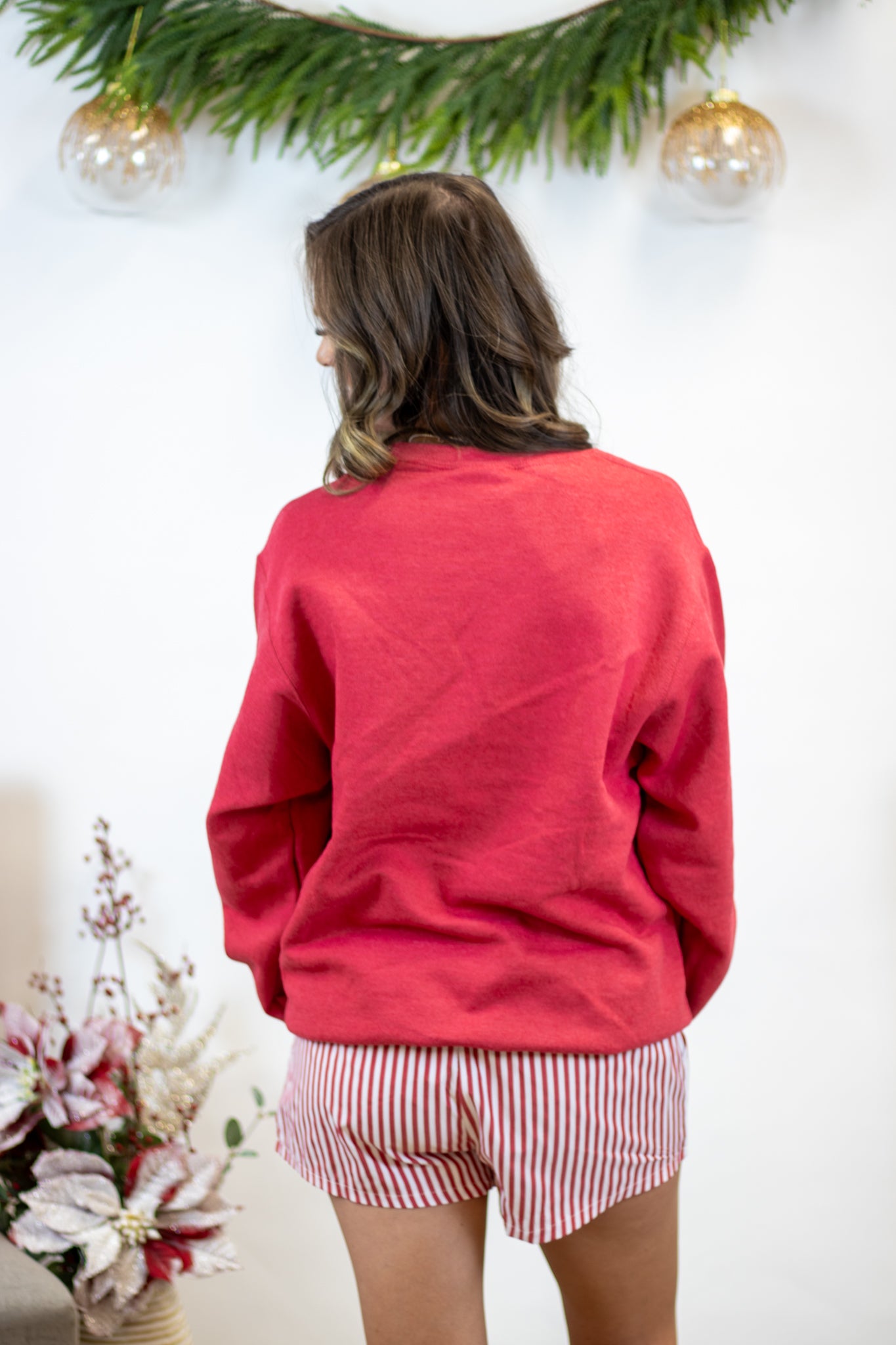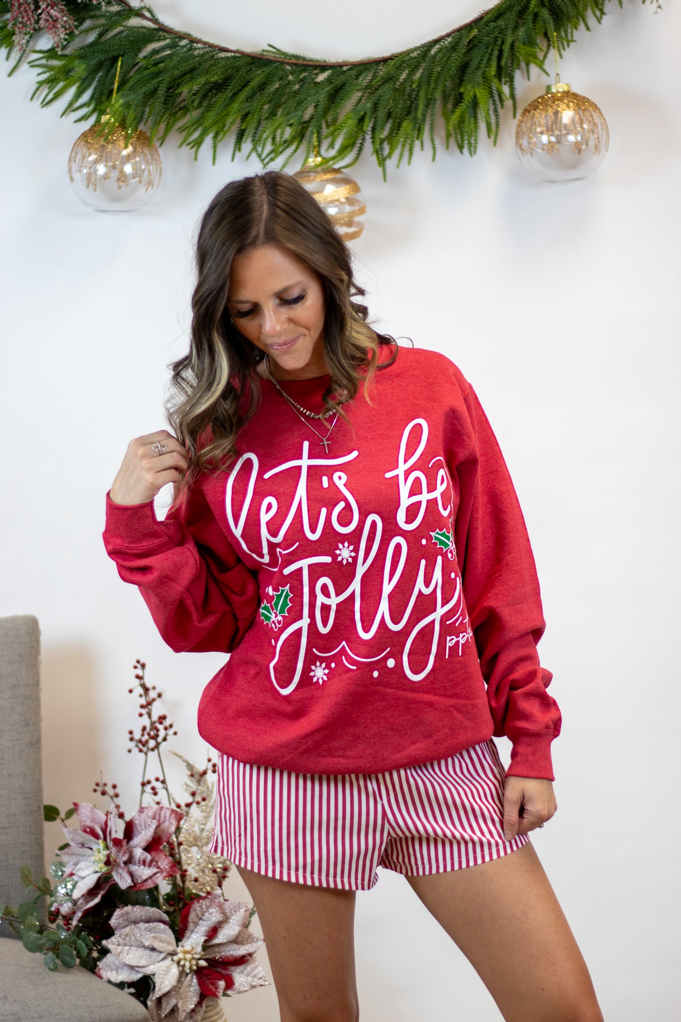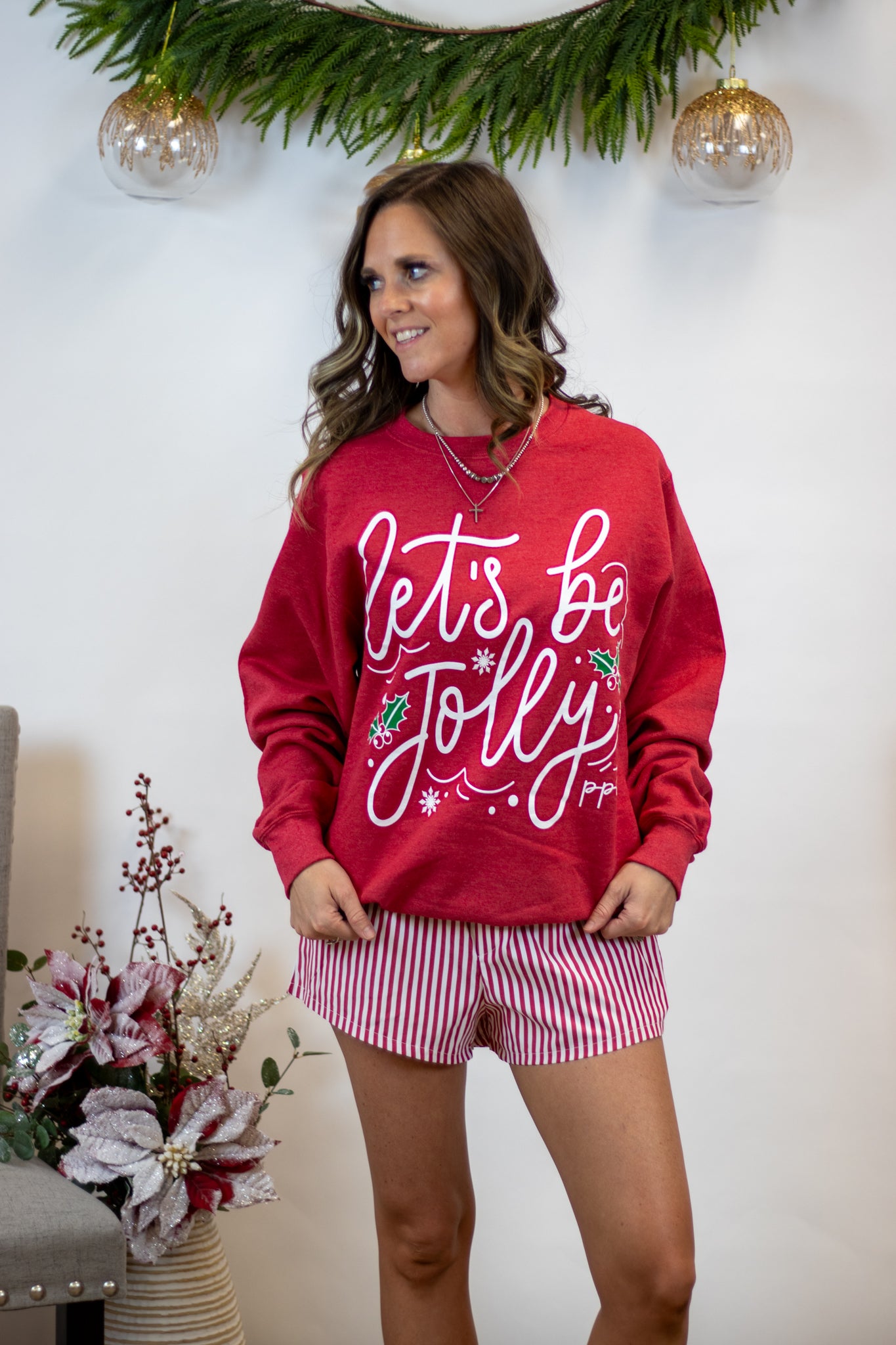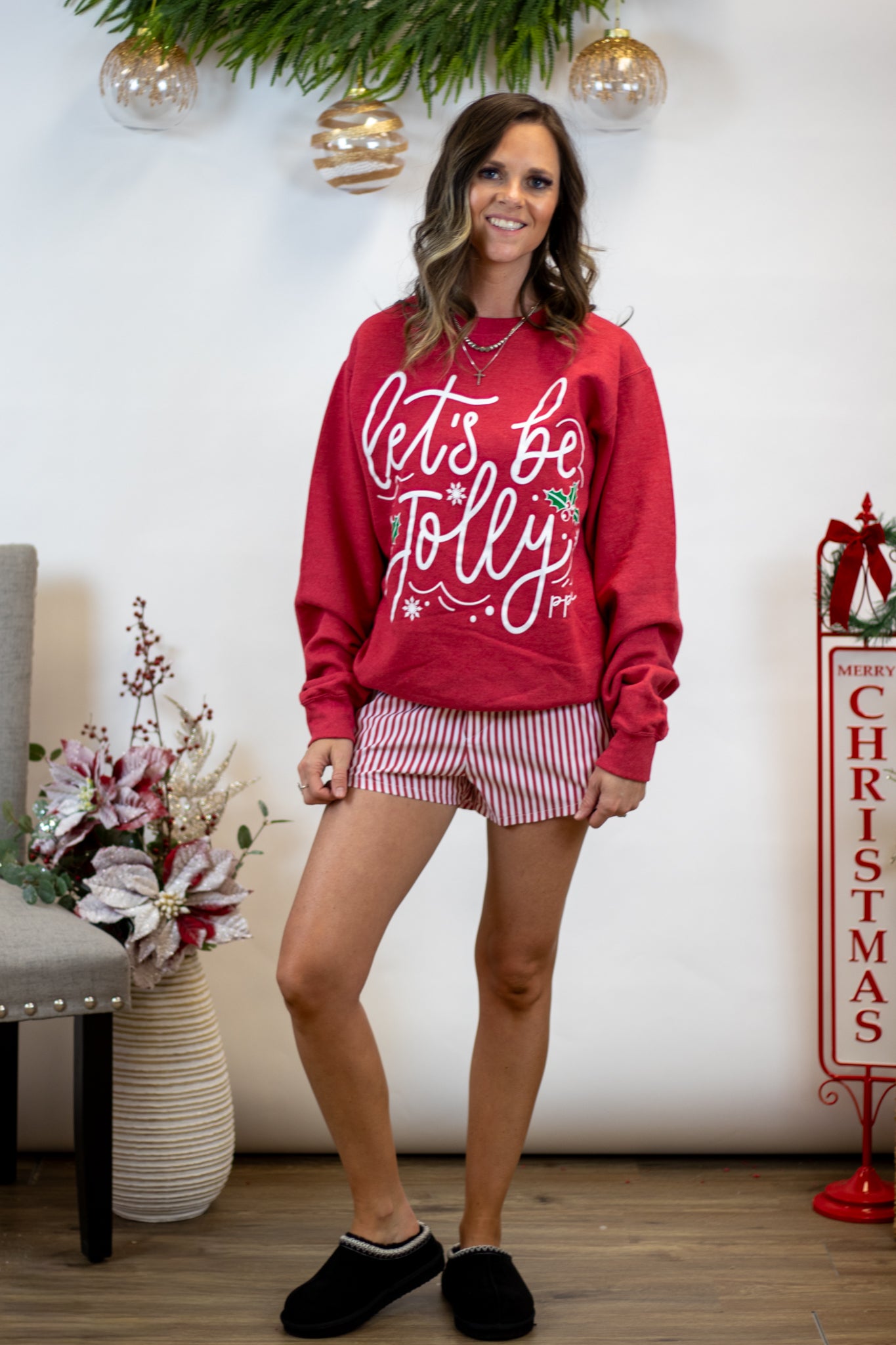 Our Let’s Be Jolly Pullover is here to bring all the cozy holiday cheer! This red fleece-lined pullover features a festive “Let’s Be Jolly” print that’s full of playful spirit. The ultra-soft interior makes it perfect for staying warm and comfy all season long. We love it paired with our pinstripe boxer shorts for an adorable lounge look that’s merry and bright. Fit is true to size.