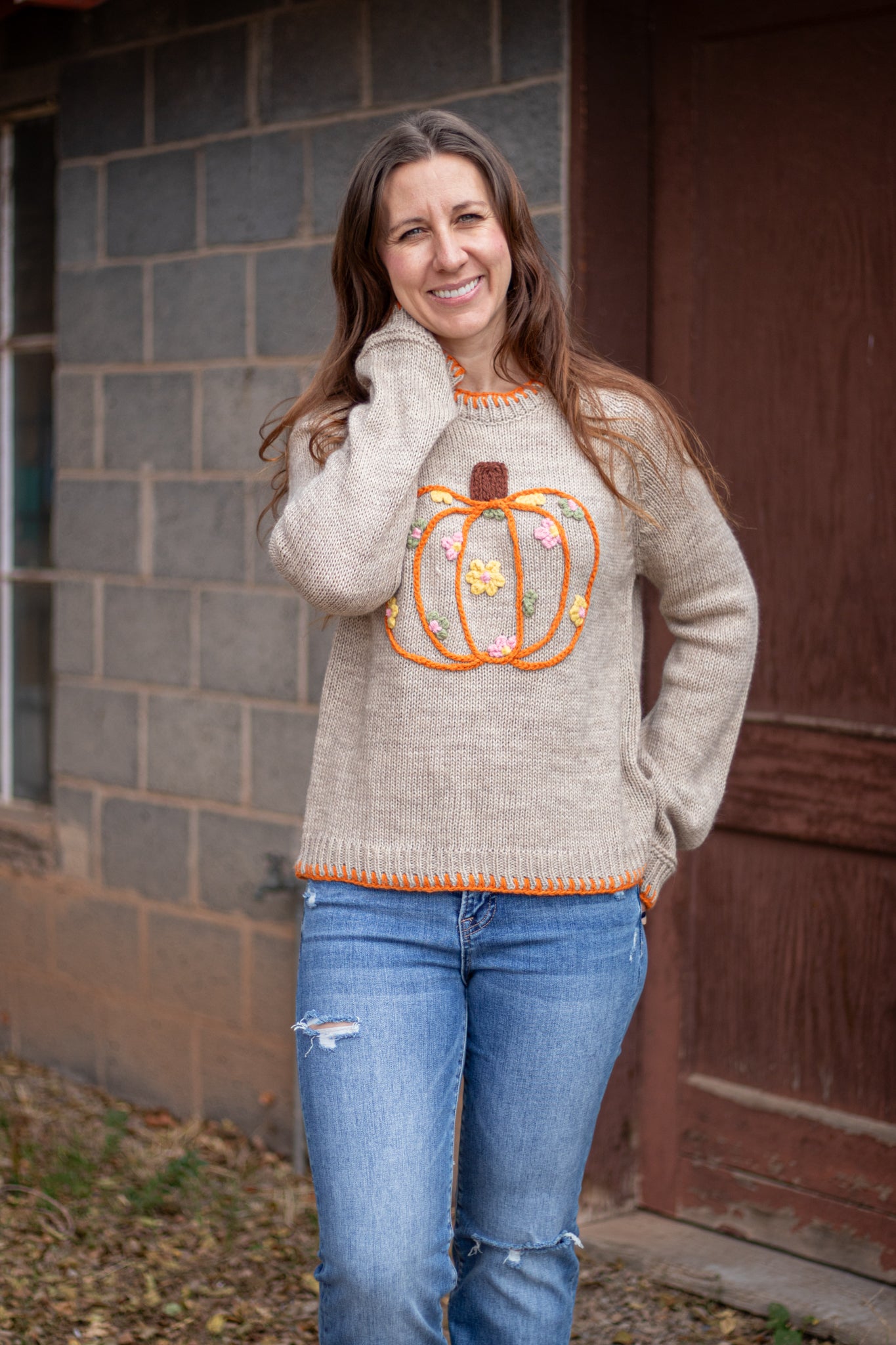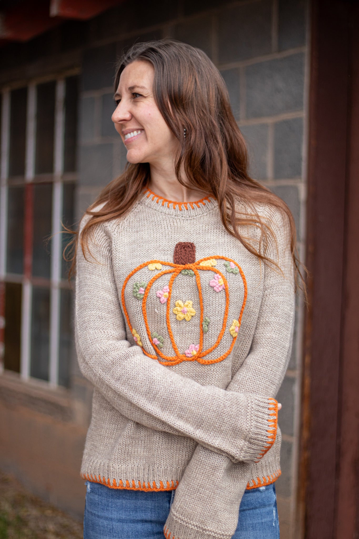 This adorable fall sweater is full of cozy charm and seasonal cheer! The soft oatmeal knit is accented with a beautifully embroidered pumpkin design, complete with colorful floral details that add a playful, feminine touch. Bright orange stitching along the neckline, cuffs, and hem adds the perfect pop of fall color. With its relaxed fit and cozy feel, this sweater pairs effortlessly with your favorite jeans or leggings for a look that’s as cute as it is comfortable. True to size for that just-right, easygoing fit.