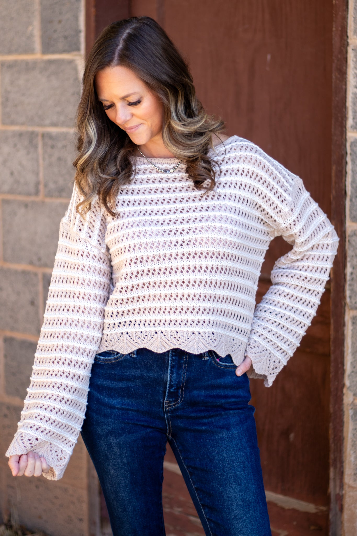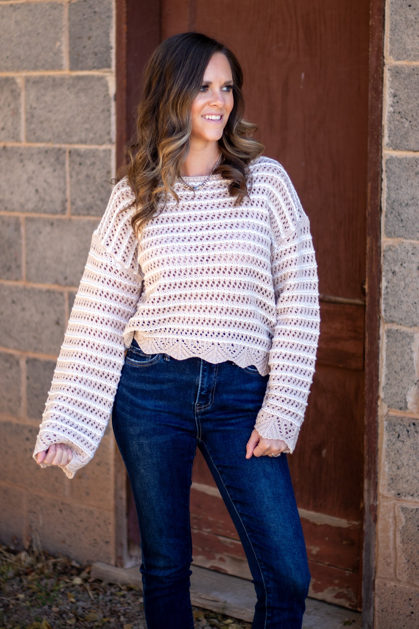 Meet your new favorite knit! This beige and white striped sweater features a beautiful open-weave texture and the most darling scalloped hem and sleeves. Its shorter length gives it a modern silhouette without feeling cropped, making it effortlessly easy to style with all your high-rise denim. Soft, feminine, and oh-so-adorable, this sweater is the perfect throw-on piece for cozy days and cute layered looks.
