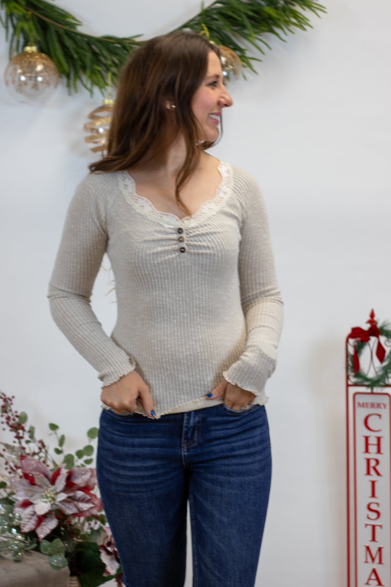 Meet the Sweeney Ribbed Lace Henley Top—the soft, feminine staple your closet has been waiting for. This oatmeal beauty is made from a cozy heathered ribbed knit that feels incredible on the skin and moves with you throughout your day. The delicate lace-trimmed neckline and sweet henley buttons add that perfect touch of charm, making it effortlessly dressy without trying too hard. We love how versatile this top is—pair it with denim for everyday chic, colored bottoms for a pop of fun, or dress it up for a night out. Fit is true to size, giving you a flattering silhouette that’s still amazingly comfortable. This is one of those tops you reach for again and again because it just works with everything.