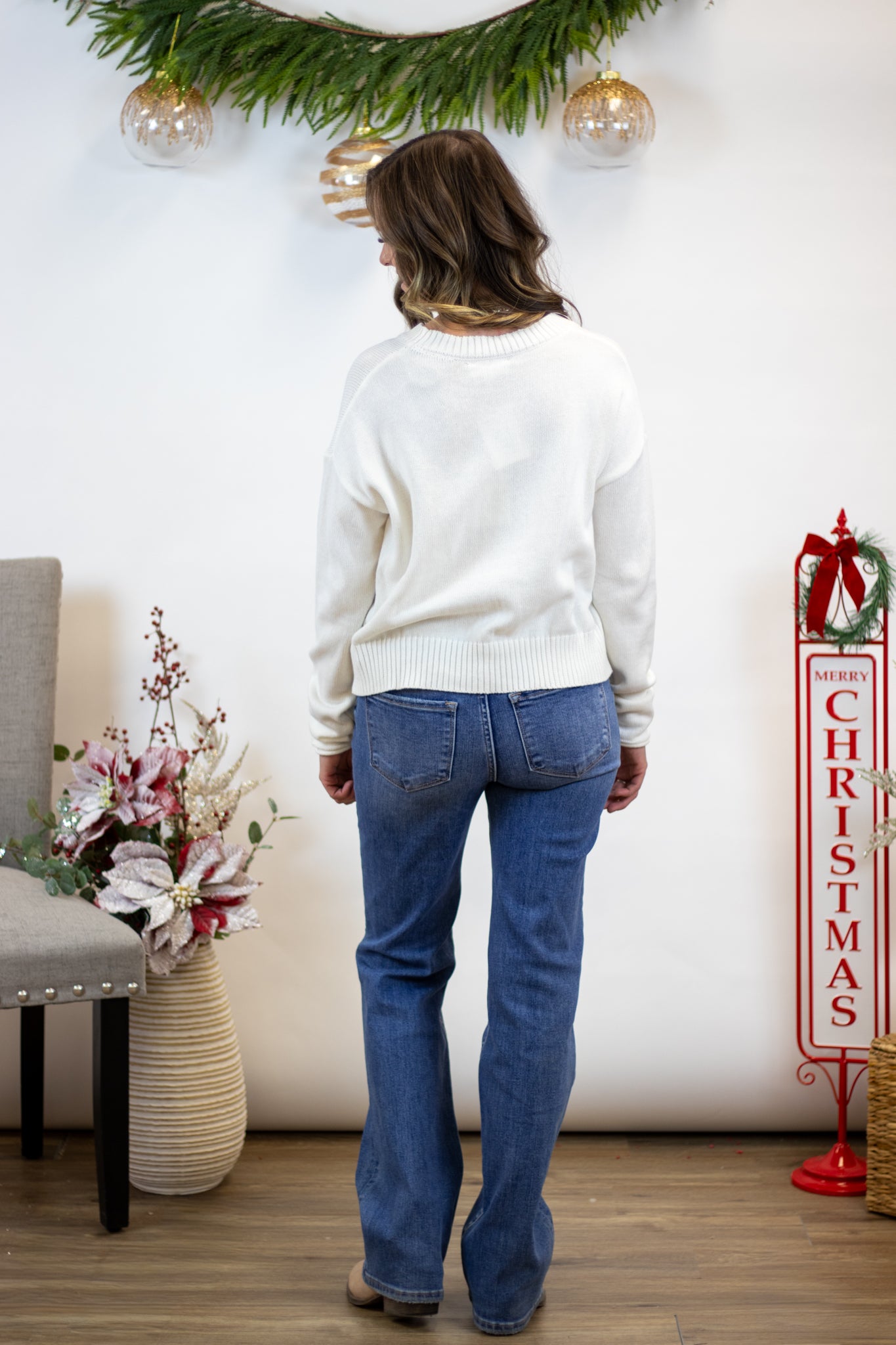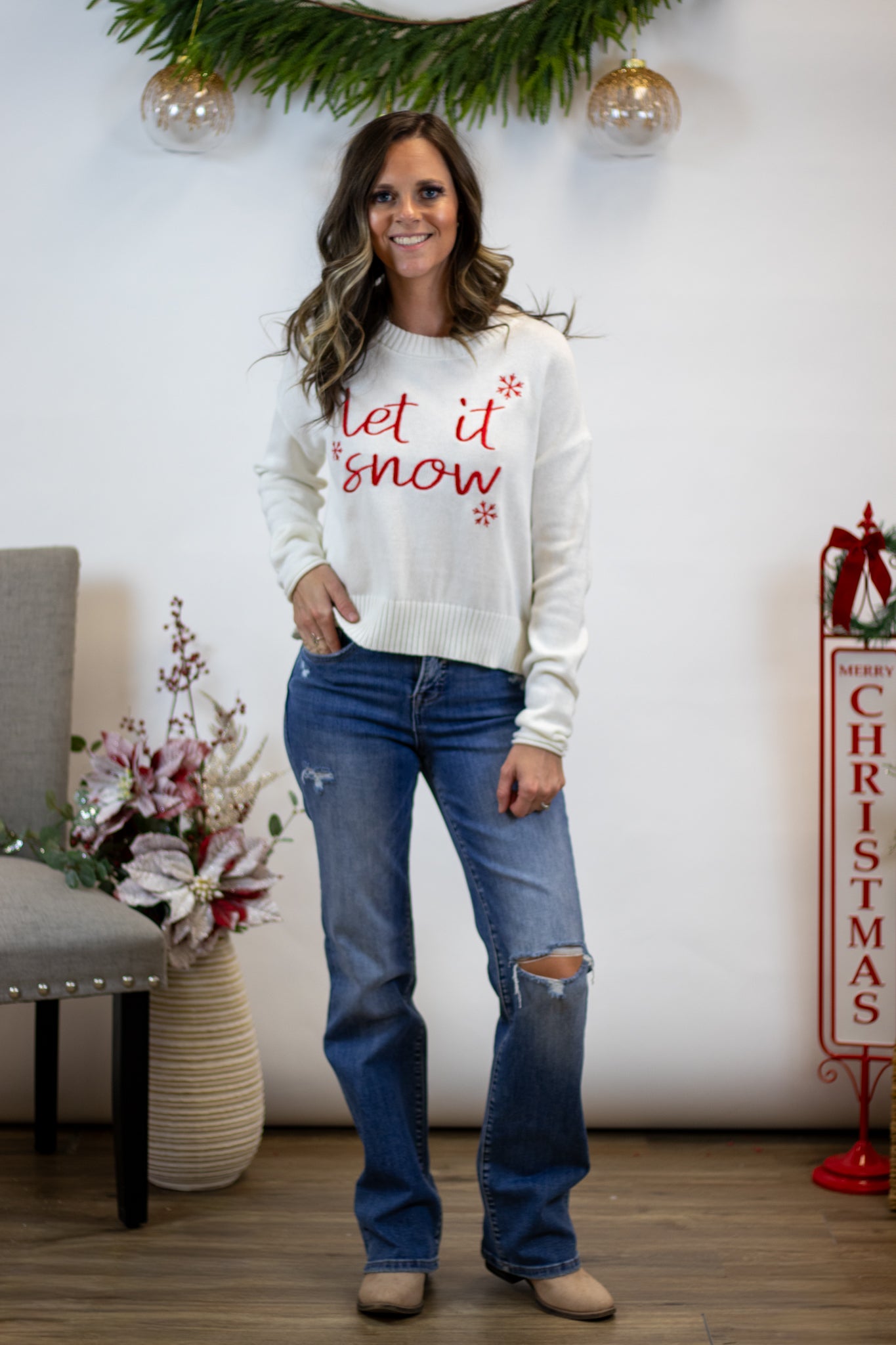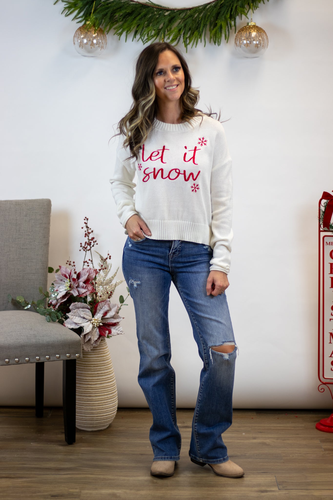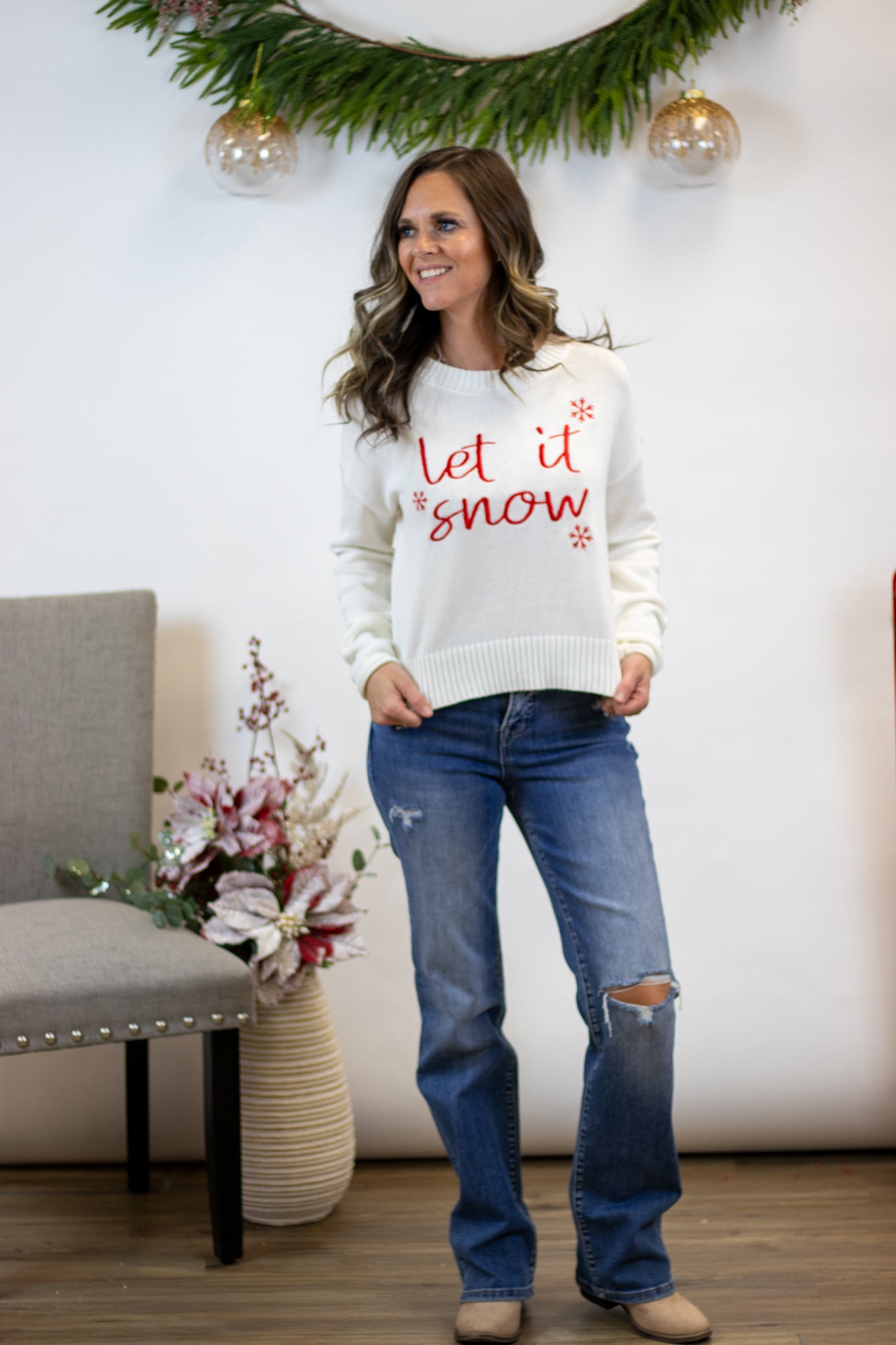 Our Let It Snow Sweater is the perfect way to welcome the winter season in style. The crisp white knit paired with red embroidered lettering creates a festive, classic look that’s full of charm. Lightweight and easy to wear, this sweater is ideal for layering or wearing on its own. Dress it up with a skirt and boots or keep it casual with your favorite denim — either way, it’s an adorable winter staple. Fit is true to size.