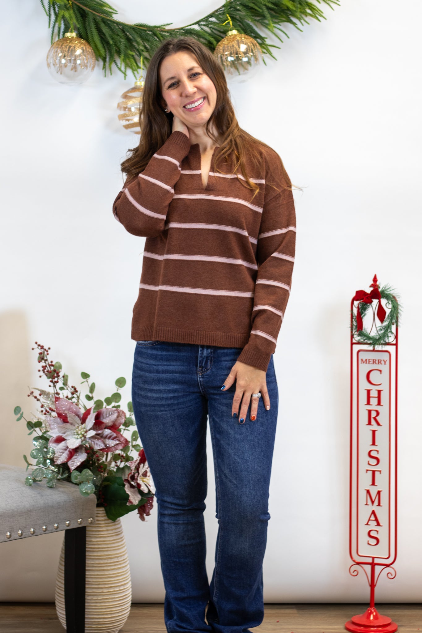 Meet the Kaylie Striped Top, the ultra-soft essential your closet has been waiting for. This dark brown and blush striped beauty feels as good as it looks, offering that dreamy, lived-in comfort with a polished finish. The subtle slit neckline adds a unique touch that elevates this everyday staple—just enough detail to stand out without trying too hard. We love how effortlessly it pairs with denim, colored bottoms, or even layered under your favorite vest. Fits true to size for a relaxed, easygoing silhouette you’ll reach for again and again. This one is truly stunning on everyone.