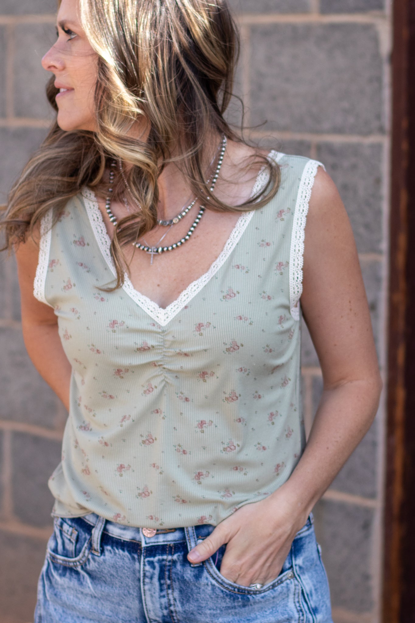 The lace trim along the V-neckline adds the prettiest delicate detail, while the ruched neckline gives it that soft, flattering shape we love. It has an easy, flowy fit that drapes beautifully without feeling fitted, making it comfortable for all-day wear.