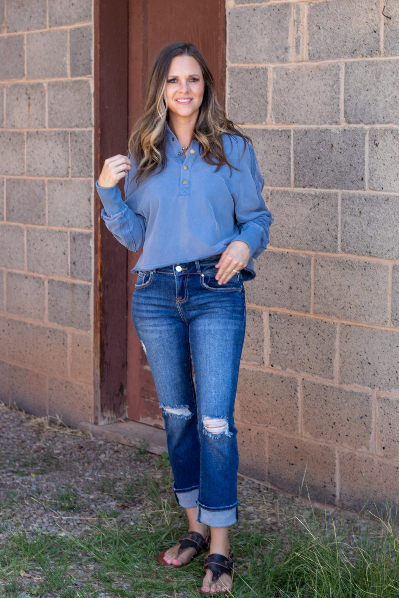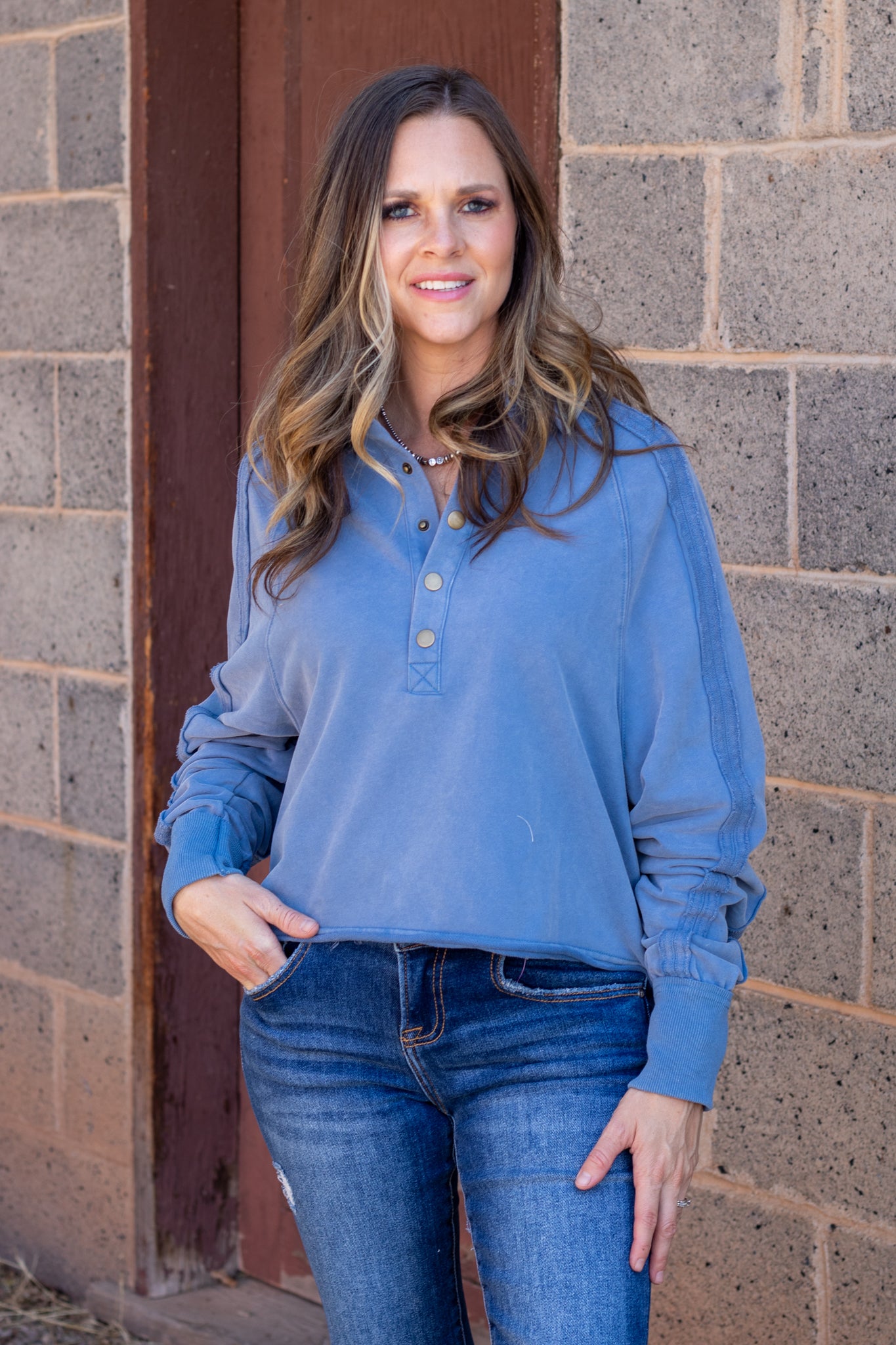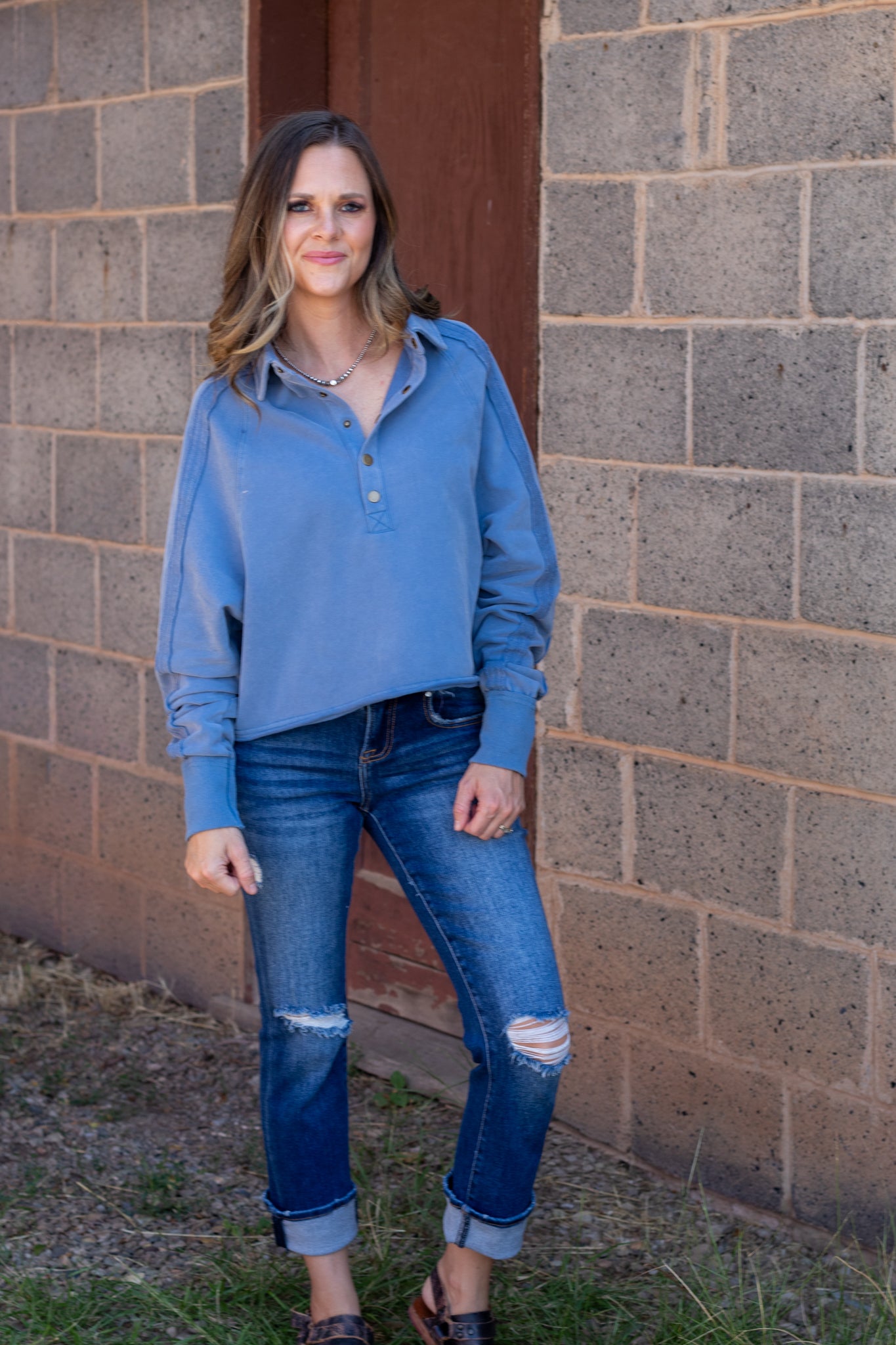 The Marley Snap Pullover is a stunning seasonal must-have that brings comfort with a pop of style. The gorgeous blue hue is guaranteed to take your blues away, while the raw hem detailing adds just the right amount of edge. Designed with a snap-button neckline and classic collar, this pullover blends casual charm with a touch of uniqueness—making it a fun, versatile piece for fall. Pair it with your favorite denim and sneakers for an easy everyday look, or layer it up for cozy evenings by the fire.
