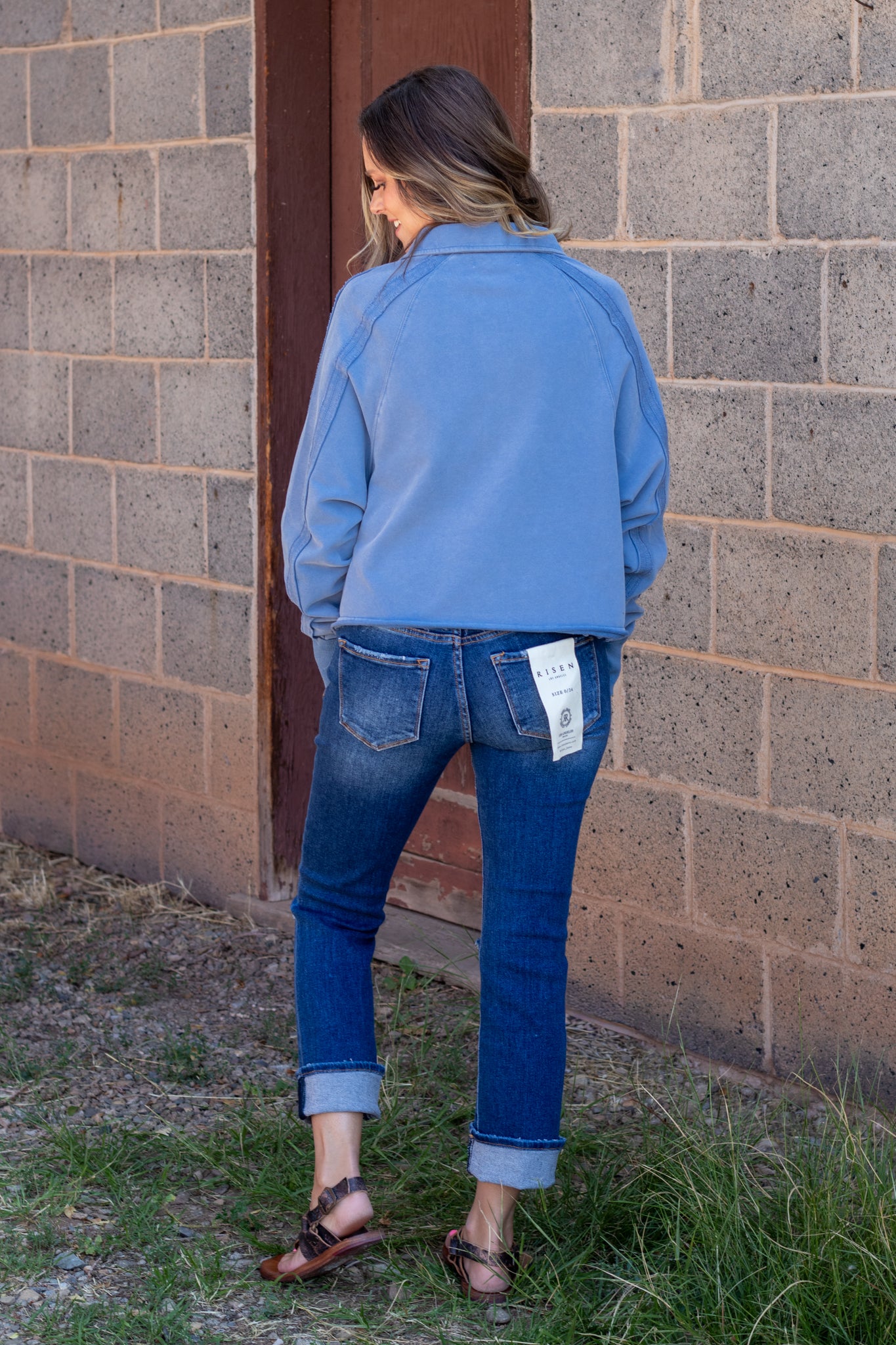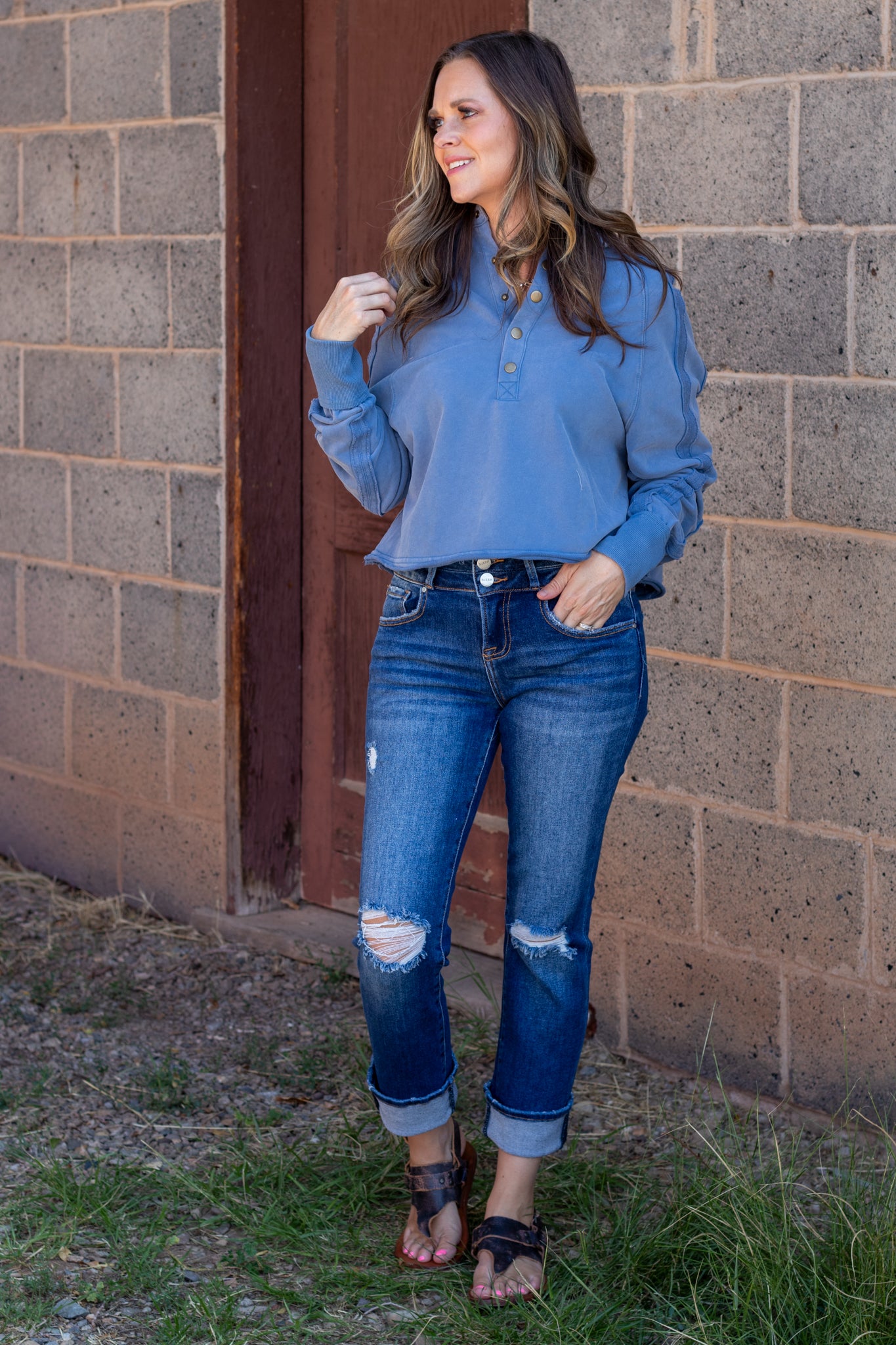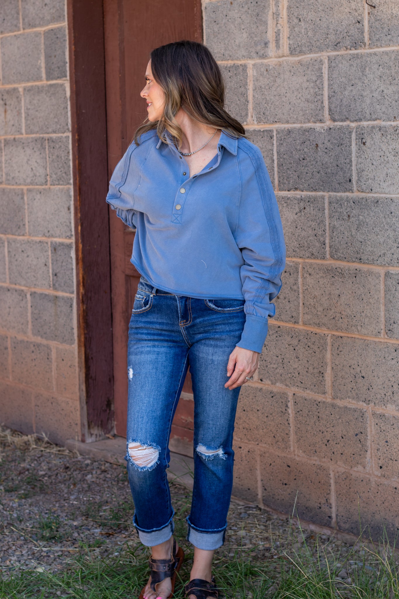 The Marley Snap Pullover is a stunning seasonal must-have that brings comfort with a pop of style. The gorgeous blue hue is guaranteed to take your blues away, while the raw hem detailing adds just the right amount of edge. Designed with a snap-button neckline and classic collar, this pullover blends casual charm with a touch of uniqueness—making it a fun, versatile piece for fall. Pair it with your favorite denim and sneakers for an easy everyday look, or layer it up for cozy evenings by the fire.