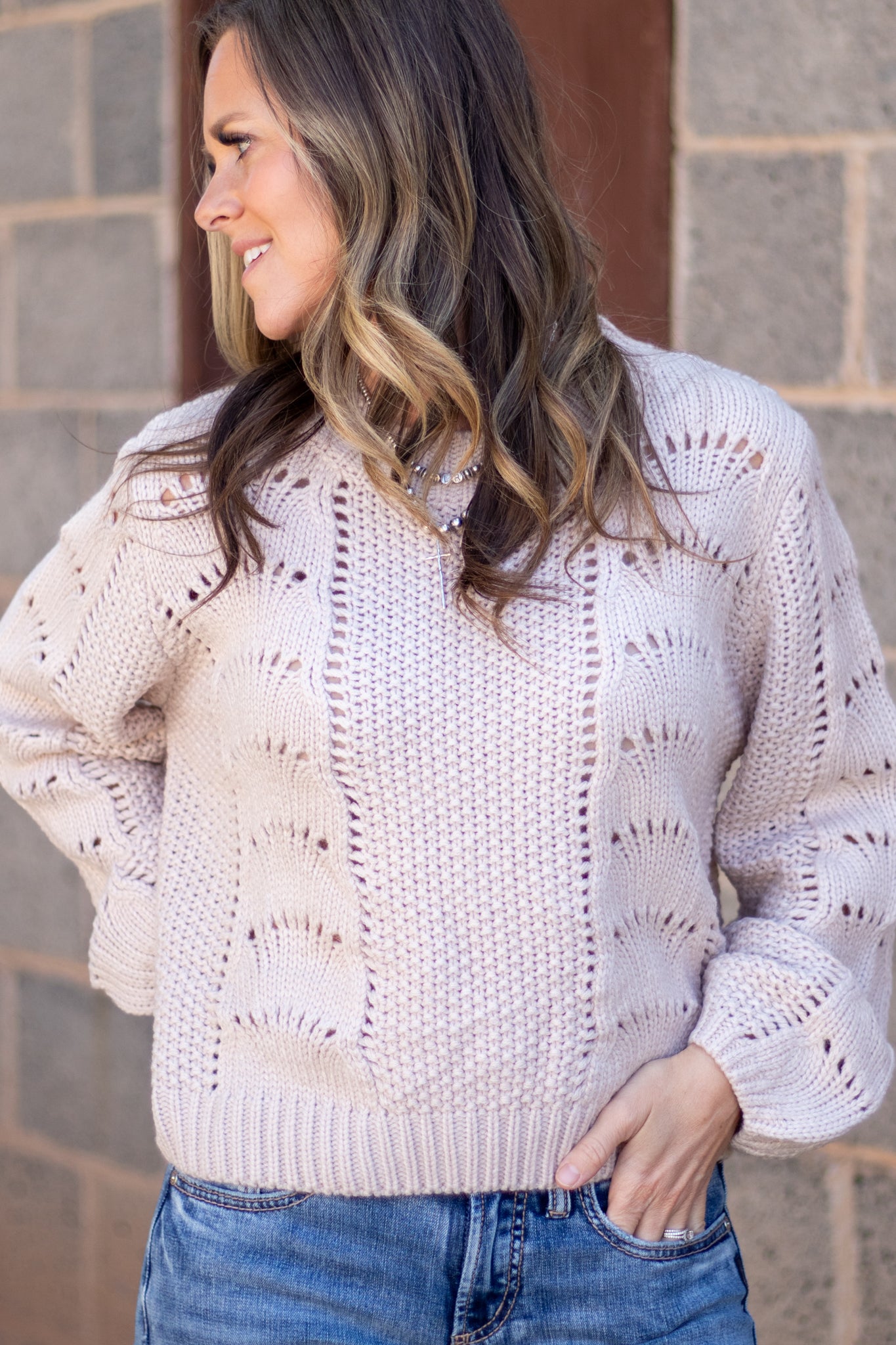 This scalloped crochet sweater is the perfect mix of cozy and chic. Available in both rust and oatmeal, this best-seller is a clear favorite for good reason. The scalloped crochet detailing gives it a touch of texture and personality, while the classic pullover design keeps it simple enough for everyday wear. Lightweight yet warm, it’s ideal for layering or wearing solo as a statement piece. Pair it with denim for a casual day out or dress it up with a skirt and boots—this sweater is as versatile as it is adorable.