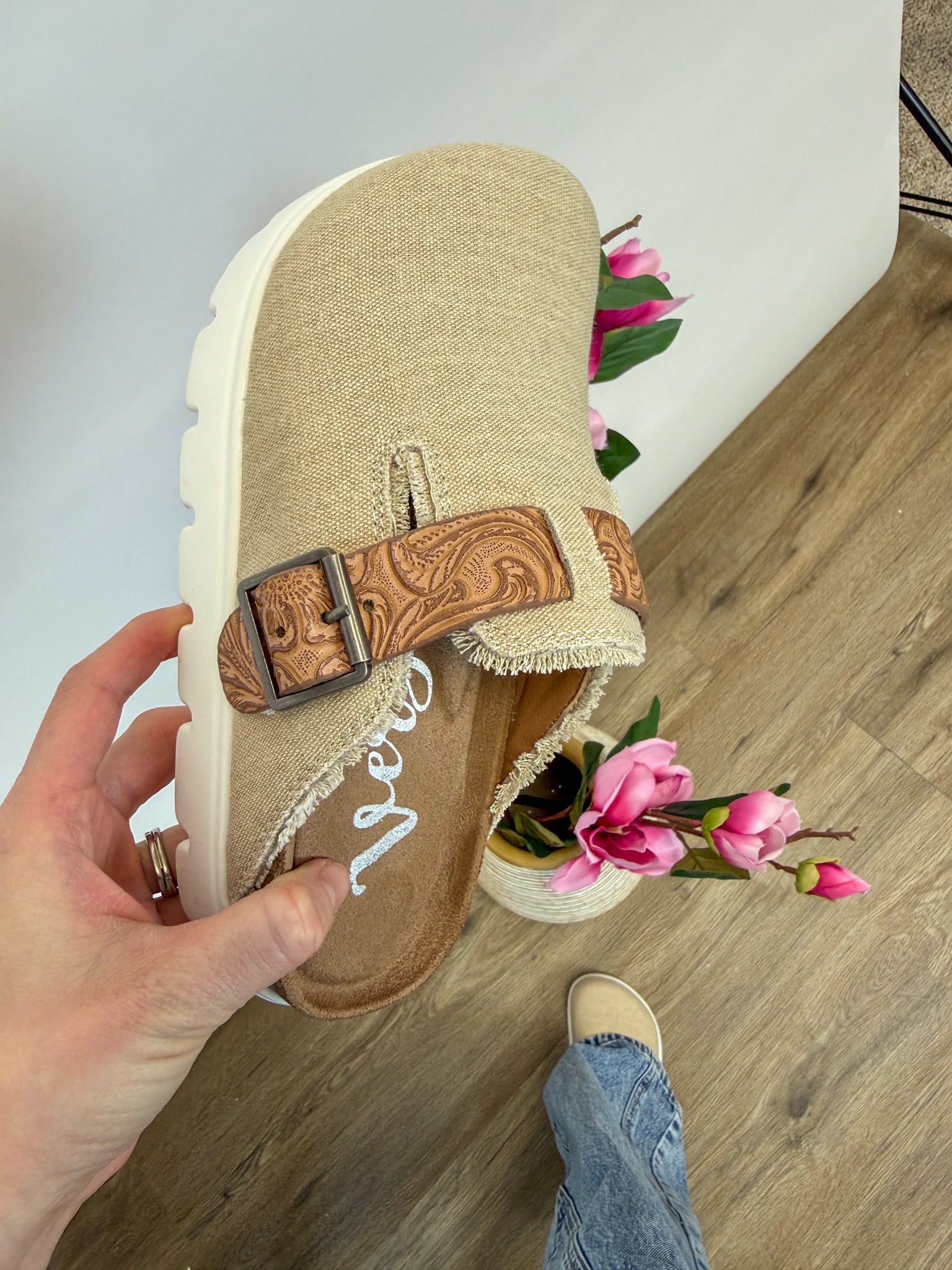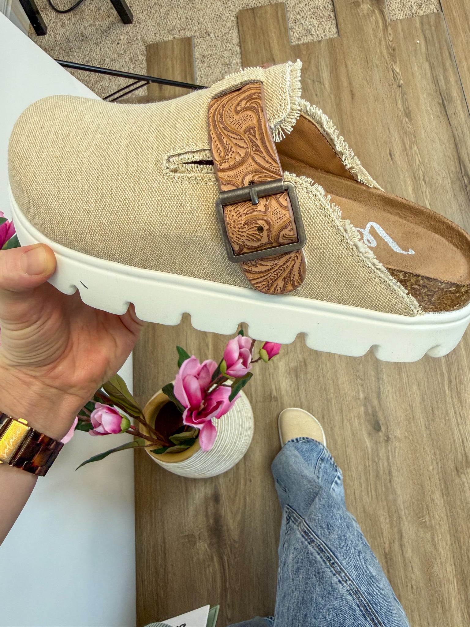 Meet the Letty Slide — the adorable little “potato shoe” you didn’t know you needed but won’t want to take off. The tooled strap with an adjustable buckle gives it that perfect touch of western charm, while the trendy white sole keeps the look fresh and modern. Easy to slide on and insanely comfortable, this pair is made for everyday wear with denim, dresses, or your favorite casual looks. We love how effortlessly it blends style and function for all-day comfort. Cute, versatile, and totally swoon-worthy… this one just might be your literal sole mate. 💕